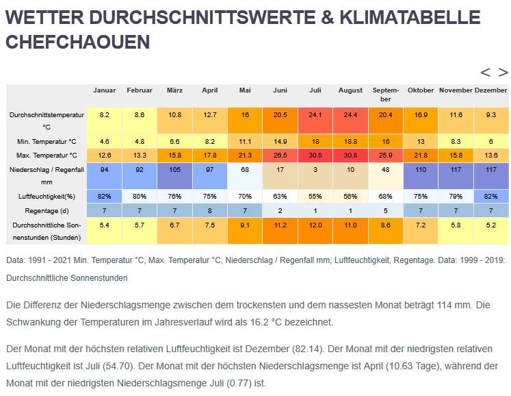Talassemtane liegt an der Ostseite des Rifgebirges und besticht durch seine abwechslungsreiche Landschaft. Es beheimatet zahlreiche Pflanzenarten und Säugetiere, darunter Berberaffen und Fischotter. Wir fahren weiter zu den Akchour-Wasserfällen und der Gottesbrücke, wo wir uns entspannen und die atemberaubende Aussicht genießen können. Anschließend kehren wir nach Chefchaouen zurück, wo wir ein spätes Mittagessen einnehmen und den Nachmittag zur freien Verfügung haben, um die Blaue Stadt weiter zu erkunden.
